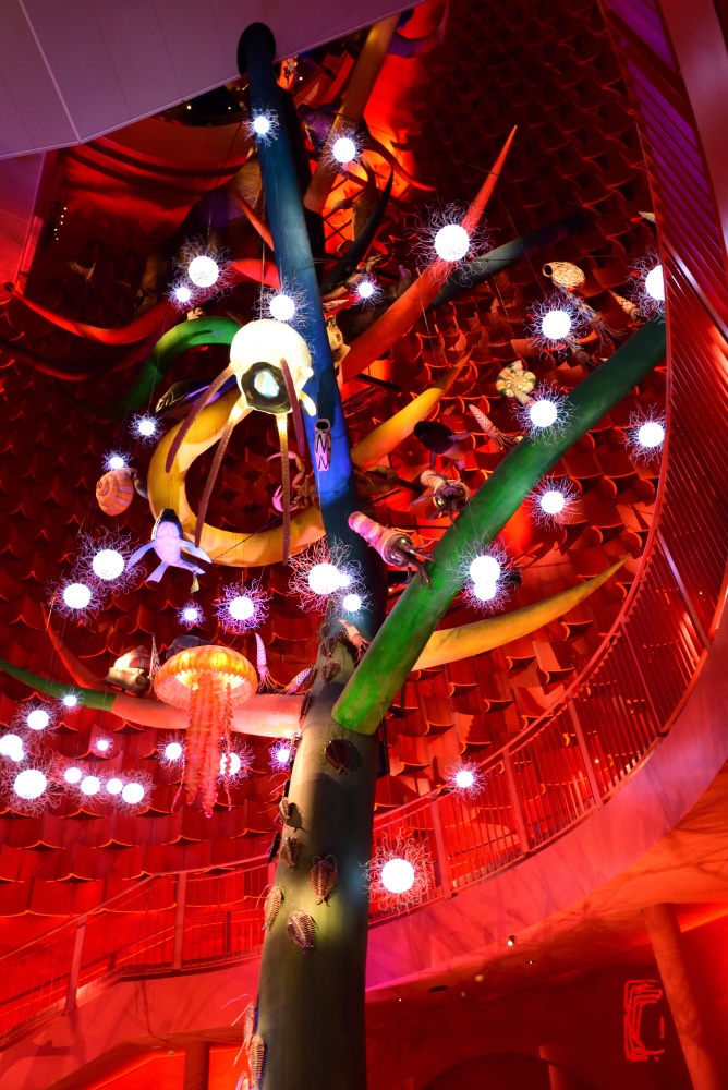 内部の吹き抜けに、原生生物から人類までの生命の進化を表現した約41メートルの「生命の樹」があり、階段を登りながら鑑賞するのだが、階段上からの撮影機材の落下による事故や展示物の破損防止の観点から、1階部分を除き撮影は禁止になっている。
